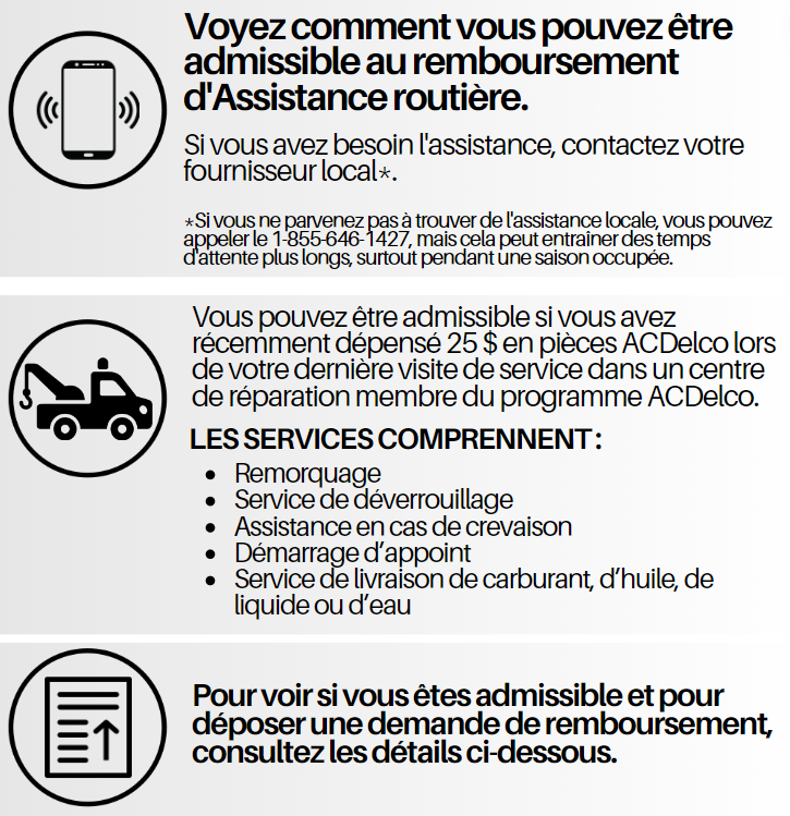L'Assistance routière ACDelco vous est offerte gratuitement lorsque vous achetez pour 25 $ ou plus de pièces ACDelco auprès d'un atelier de réparation local membre de nos programmes de fidélité. Il commence à la date indiquée sur votre facture originale émise par l’atelier participant, pour une période de 12 mois. Cet avantage est offert uniquement à l’acheteur original dont le nom figure sur la facture originale et il n’est pas transférable. La couverture est limitée strictement au véhicule spécifique identifié sur la facture originale et selon les directives ci-dessous.